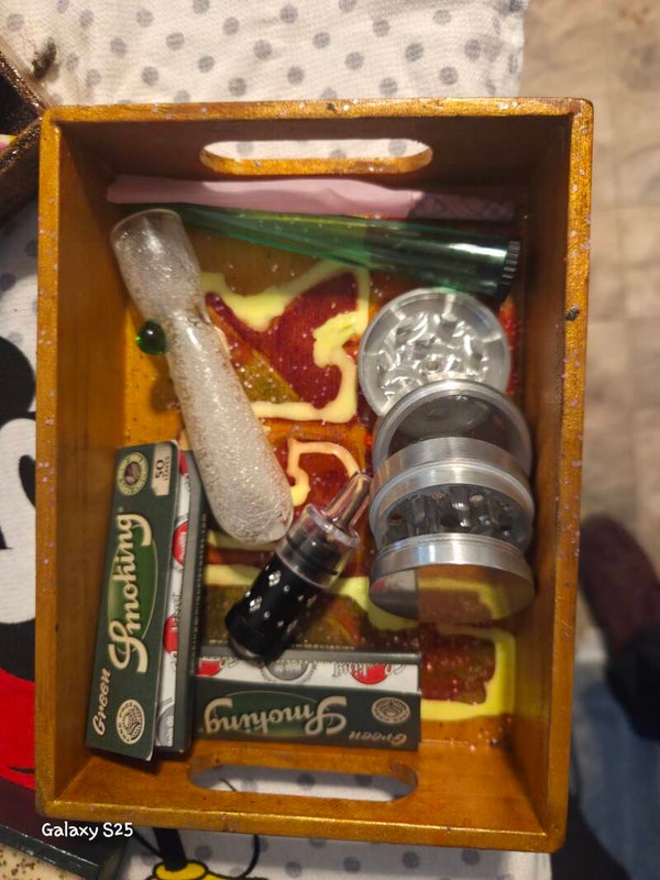 Little rolling tray with a couple of small pipes and papers and cones.Everything you need to get started on a good session. All the trays have unique design and are fun to use. And fun to share with your stoner buddies. Twist up a fatty and enjoy you.Even have a pipe to smoke the roach in.